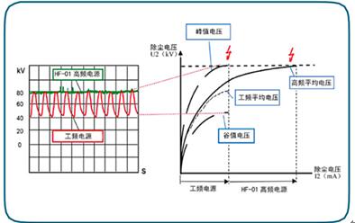 與工頻電源相比,高頻電源的供電電流由一系列窄脈沖構成,其脈沖寬度、幅度及頻率均可以調整,根據不同工況提供最合適的電壓波形,提高除塵效率,控制方式靈活形。間歇供電時(shí),可有效抑制反電暈現象,特別適用于高比電阻粉塵工況。